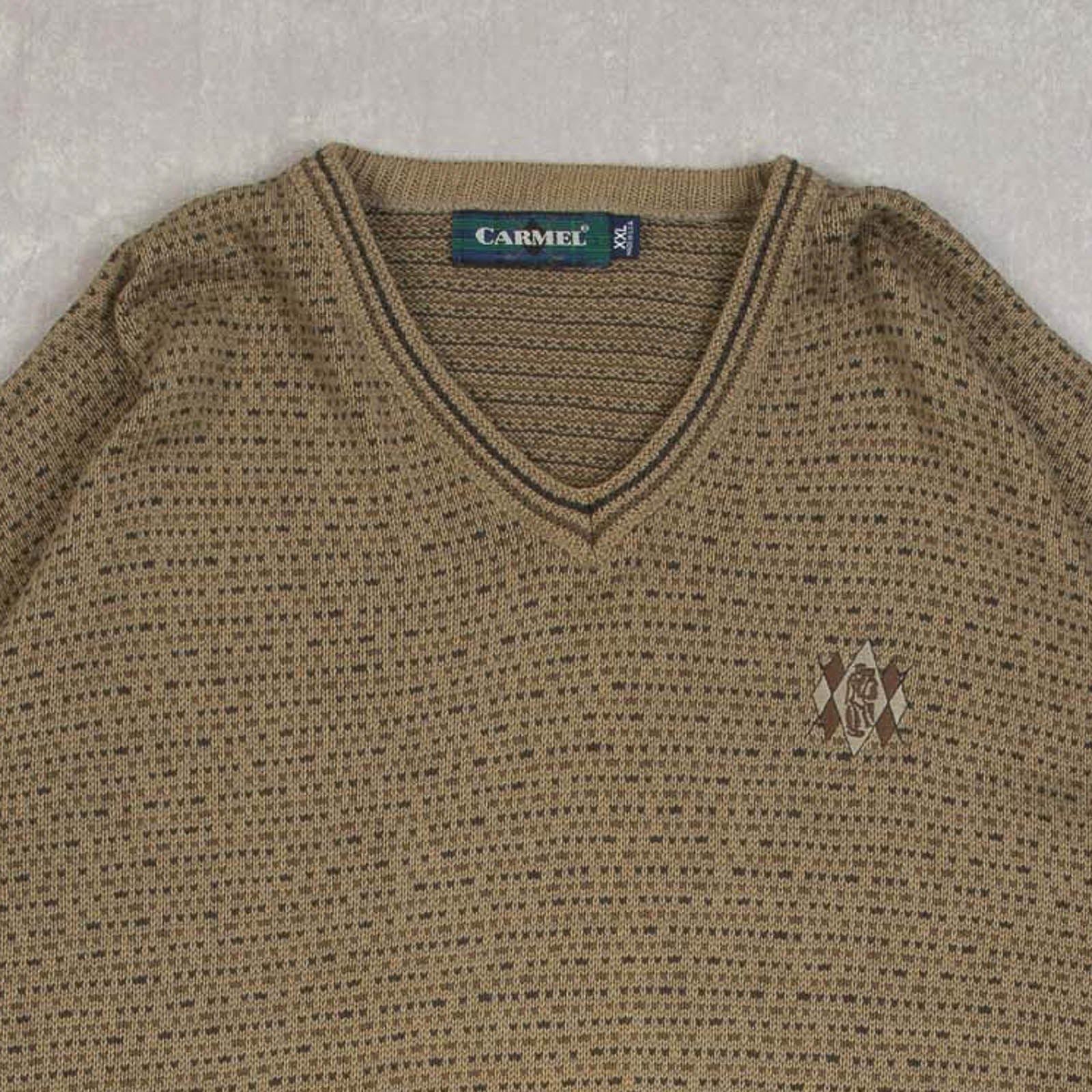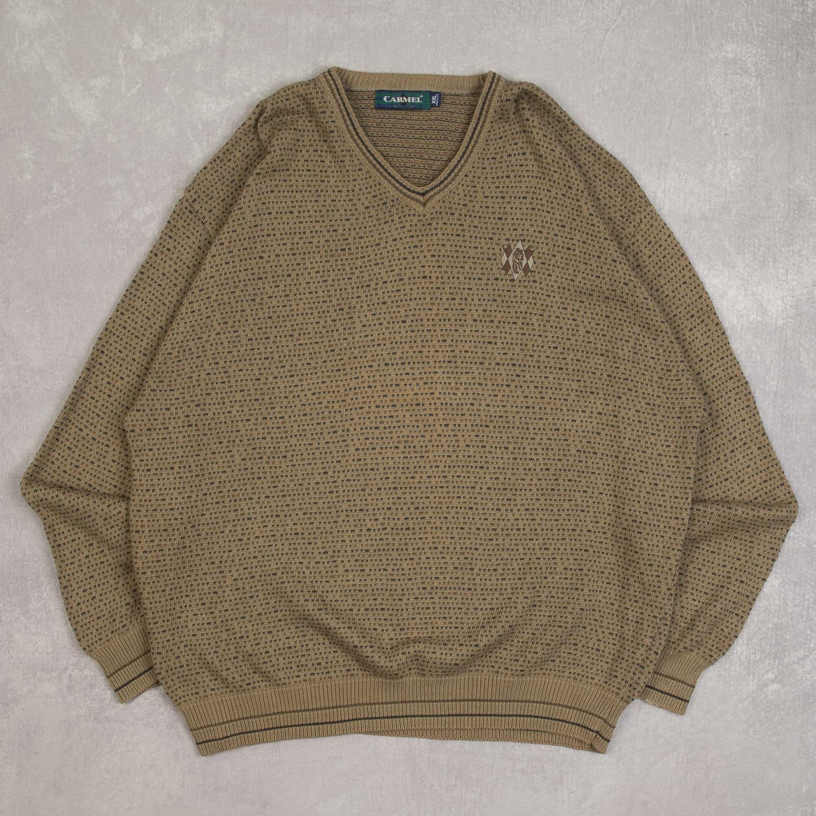 MEN'S VINTAGE 1990S PATTERNED V-NECK KNITTED JUMPER - XX-LARGE